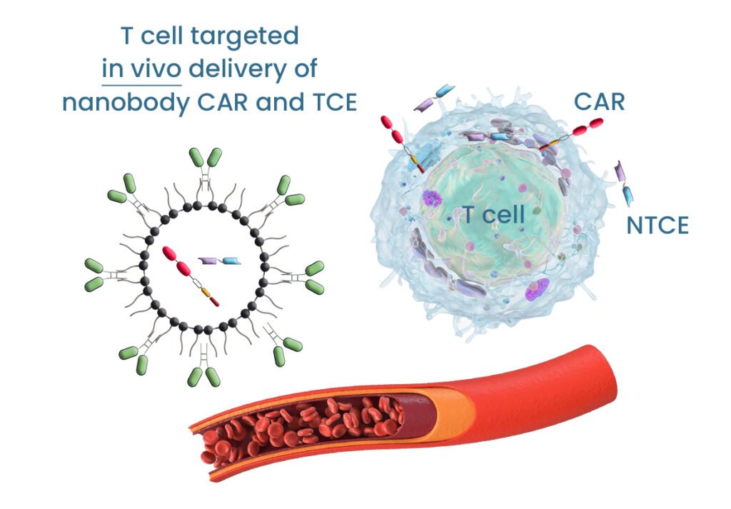 1. Prevents antigen escape through multi-targeting 2. Secreted small NTCEs penetrate solid tumors, activate bystander T cells, enhance potency, and reduce exhaustion 3. Targeted LNP enables precise in vivo CAR delivery, significantly lowering manufacturing costs